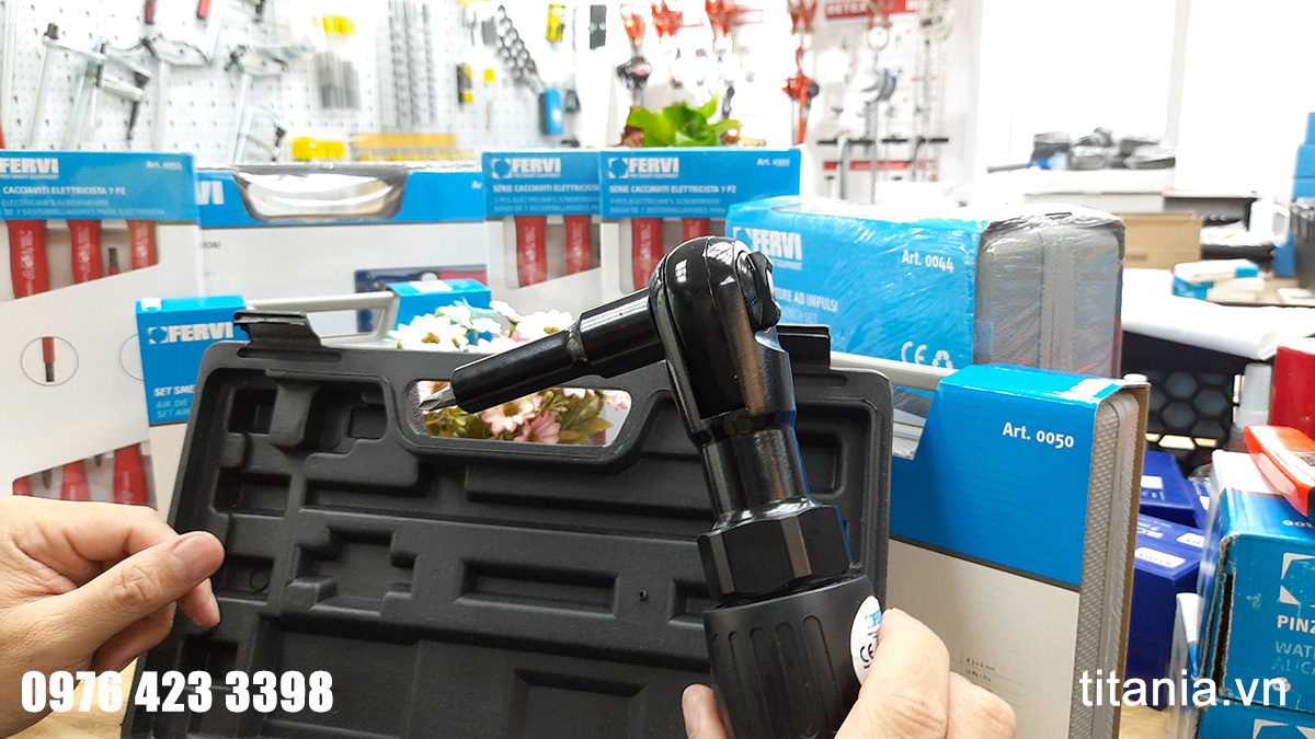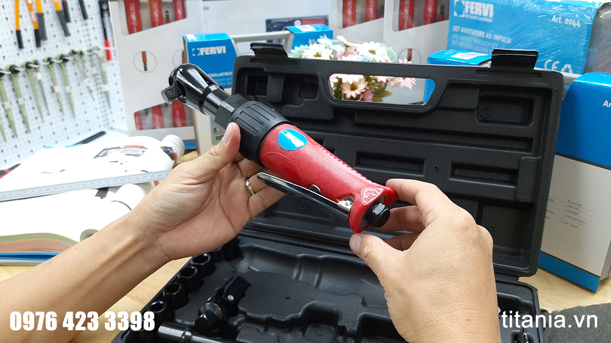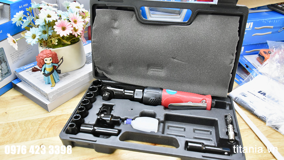 Bộ máy xiết bu lông đầu ngang đi kèm rất nhiều phụ kiện hỗ trợ. Súng xiết ốc đầu ngang cho phép tiếp cận các vị trí hẹp mà súng bình thường không hữu dụng. Lực xiết nhẹ chỉ 65 Nm, có các chức năng như đảo chiều quay, điều chỉnh khí đầu vào. Có nhiều phụ kiện như thanh nối dài, 7 đầu socket, đầu lắt léo, đầu vít để sử dụng trong nhiều trường hợp.