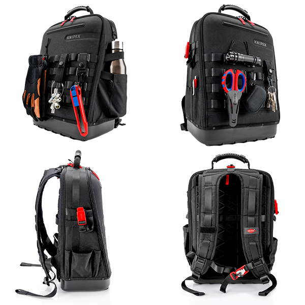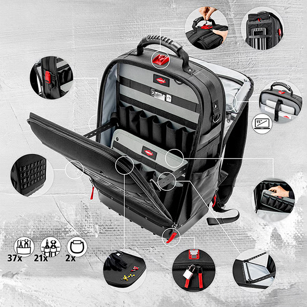 Knipex 00 21 50 LE đeo lưng. Đã là ba lô thì phải đeo trên lưng thôi. Phát triển cho kỹ thuật viên cần giải pháp mang theo dụng cụ cơ động. Nó rất gọn gàng và an toàn khi bạn di chuyển nhiều. Ba lô trống, không kèm dụng cụ, thể tích 18 lít, chịu tải tối đa 15 kg.