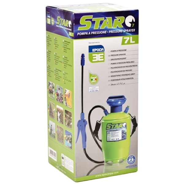 Bình phun sương 7 lít có tay phun rời Epoca Star 7. Bình xịt 7 lít tích hợp sẵn bơm kiểu thụt hay nhồi, có seal làm kín, đảm bảo giữ áp trong thời gian dài, thậm chí qua ngày. Bình có trang bị van xả áp khi dùng xong hoặc áp bơm trong bình vượt ngưỡng an toàn. Van phun có áp suất max 7 bar. Điều chỉnh chùm tia phun trên tay phun rời. Nhà sản xuất Epoca trang bị sẵn cho bạn quai đeo hông 120cm, dễ dàng mang theo khắp khuôn viên. Tay phun được nối với bình xịt bằng một đoạn ống mềm 2m, cơ động và an toàn trong quá trình vận hành. Béc phun bằng nhựa, điều chỉnh chùm tia phun được.