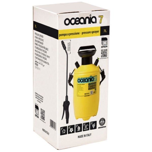 Bình tưới cây 7 lít có vòi rời Oceania 7 - Epoca - Italia. Bình được đóng gói trong thùng carton với đầy đủ phụ kiện. Áp suất maximum 3 bar, có van an toàn chống nổ bình. Sử dụng cho các dung dịch chăm sóc cây, làm sạch và có nhiệt độ từ 5 oC đến 30 oC. Có quai xách đeo vai, cài vòi tưới đầu cong trên tay cầm. Sản xuất 100% tại Italia.