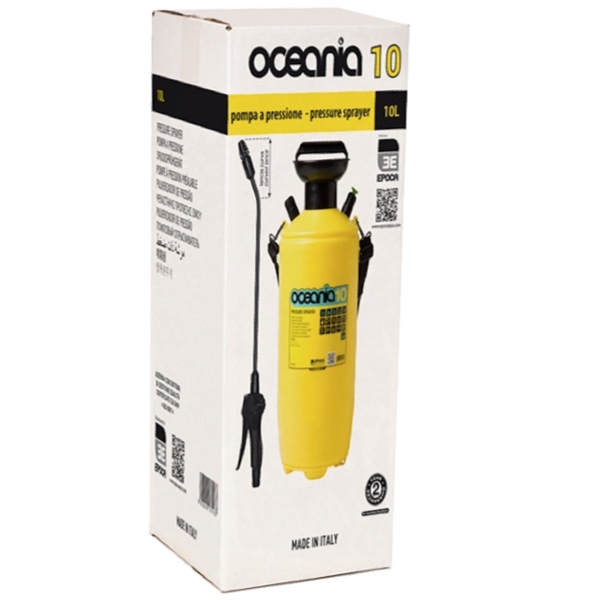 Bình tưới cây 10 lít Oceania sản xuất tại Ý - EPOCA chính hãng. Sản xuất tại Italia, dùng trong chăm tưới cây trồng. Dung tích bình chứa 10300ml, thể tích hữu dụng 8240ml. Có van an toàn chống nổ bình, áp lực mở van 3 bar. Sử dụng vòi rời, tay bơn nối với bình bằng ống mềm.