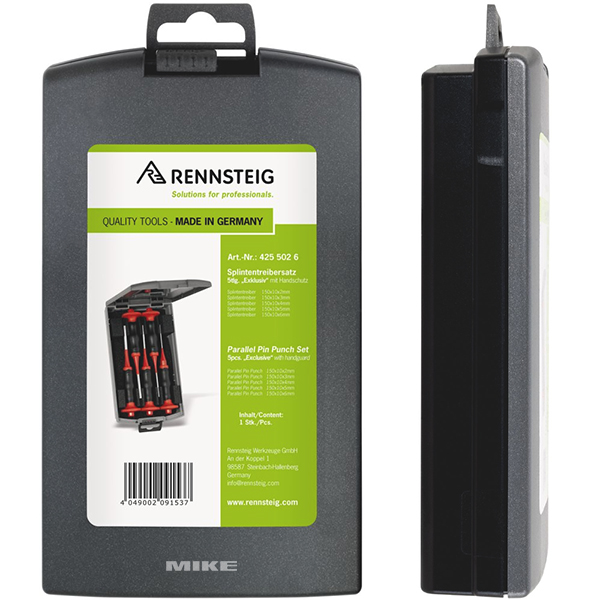 Bộ đột chốt song song Rennsteig 425 502 6 “Exclusive” cung cấp giải pháp gọn gàng cho các công việc tháo, đóng và chôn chìm chốt trong gia công cơ khí. Thép dụng cụ hợp kim cao được tôi và ram toàn bộ, đầu va đập an toàn. Có mũ bảo vệ tay 2 thành phần, bộ đục chắc chắn, an toàn khi thao tác.