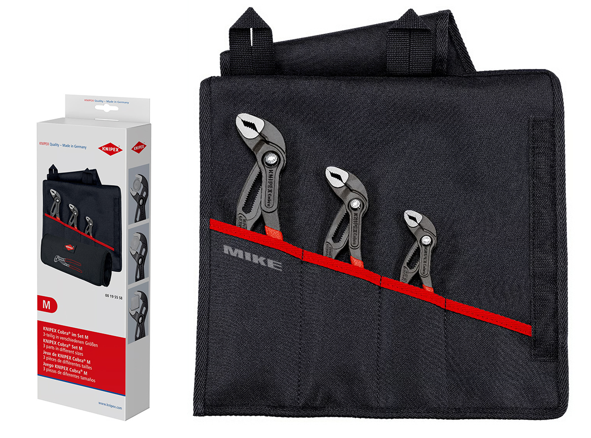 Bộ kìm Knipex 00 19 55 S8 gồm ba kìm mỏ quạ Knipex Cobra® 87 01. Có chiều dài lần lượt 125 mm, 180 mm và 250 mm. Đi kèm túi đựng bằng vải polyester bền chắc, đóng gọn bằng dải dán. Mỗi cây kìm đều thuộc thế hệ mỏ quạ công nghệ cao của Knipex. Được thiết kế với cơ chế tự kẹp chắc chắn, chống trượt trên chi tiết,. Tạo lực siết lớn mà không cần dùng nhiều sức tay.