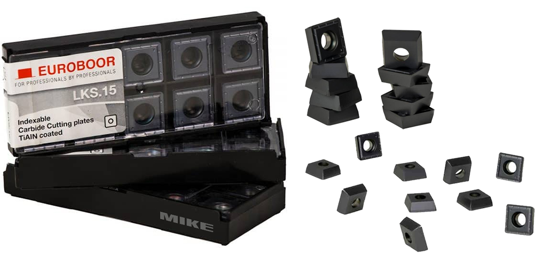 Bộ lưỡi cắt LKS.15 dùng cho máy vát mép Euroboor B60 và B60S. Lưỡi có dạng vuông, lắp theo cơ chế indexable insert. Mỗi bộ gồm 10 lưỡi, gắn trực tiếp vào đầu phay của máy. Kích thước tiêu chuẩn hệ mét. Ứng dụng cho gia công vát mép trên thép, thép hợp kim crôm, nhôm, hợp kim nhôm, đồng thau và nhựa. "Indexable insert" là loại lưỡi cắt rời có nhiều cạnh. Cắt được kẹp vào dao bằng vít hoặc cơ cấu kẹp, thay vì mài lại sau khi mòn.