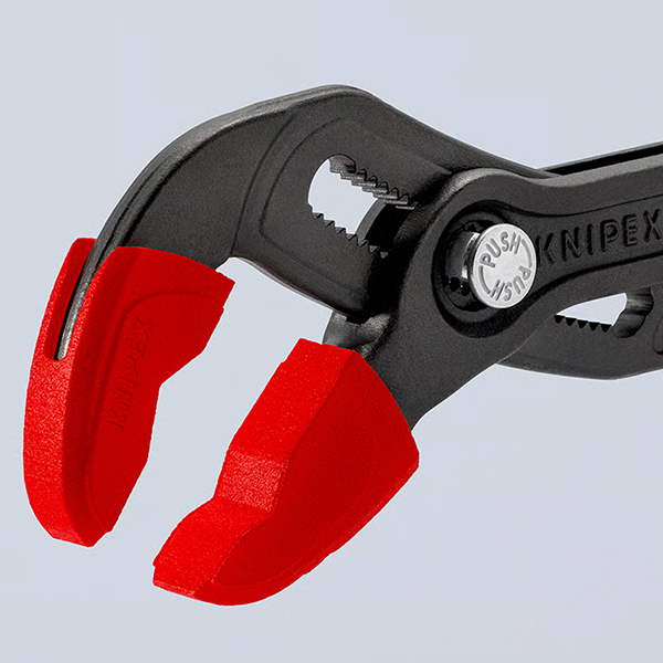 Chất liệu nhựa dùng cho Knipex 87 09 250 V01 được tối ưu cho nhiệm vụ làm lớp đệm trung gian: đủ cứng để truyền lực kẹp ổn định, đủ mềm để giảm tác động cơ học trực tiếp từ răng kìm lên bề mặt chi tiết.