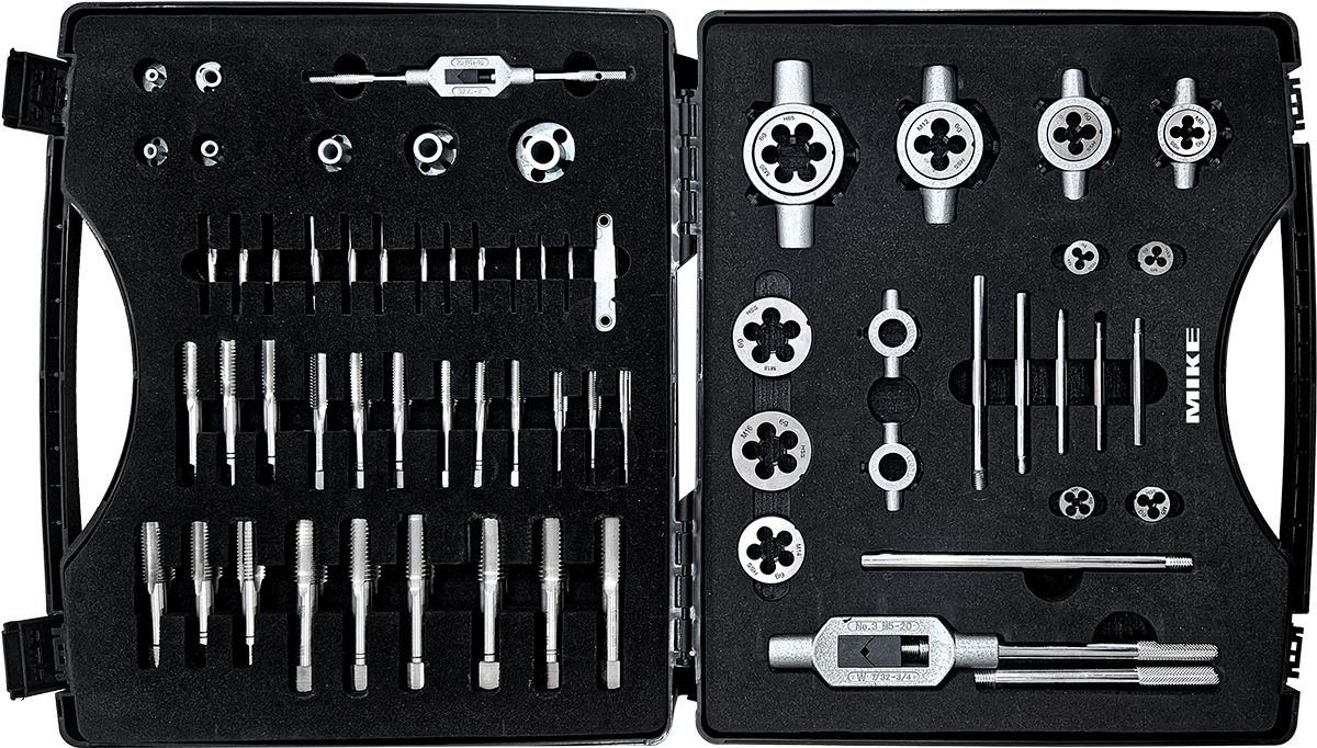 Bộ dụng cụ taro ren bằng tay cho ren trong - ngoài kết hợp gồm 60 chi tiết. Taro qua 3 bước cho tất cả các kích thước từ M3 đến M20, mỗi size gồm 3 cây THÔ - TRUNG - TINH. Bao gồm cả tay quay tương ứng. ELORA Germany.