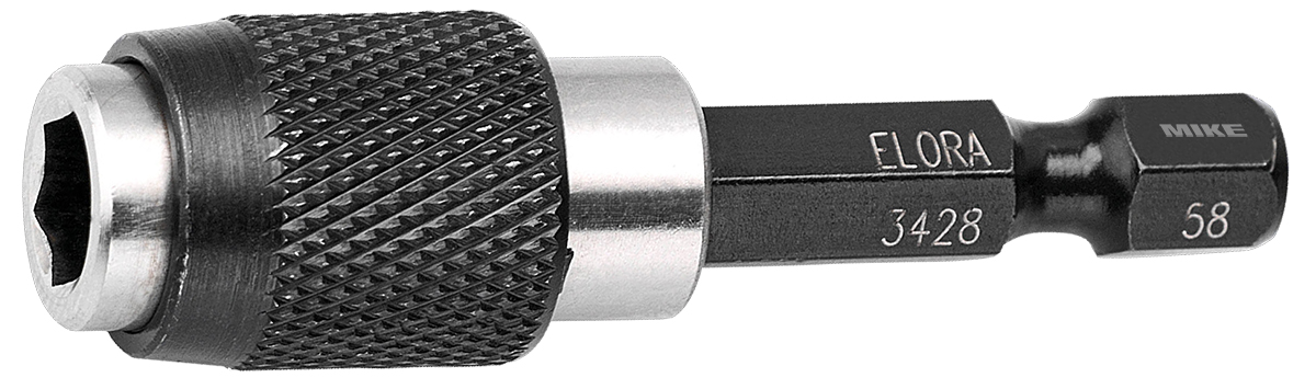 Đầu nối lục giác ELORA 3428 có khóa vít nam châm vĩnh cửu, chuôi 1/4 inch. Hệ thống khóa và phóng nhanh, tuân thủ tiêu chuẩn DIN 3126 D 6,3 và DIN ISO 1173. Chiều dài tổng 51mm, trọng lượng 24g.