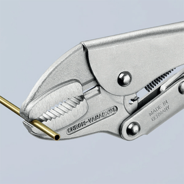 Kìm bấm chết Knipex 41 04 300 có chiều dài 300 mm, thuộc dòng heavy duty, thiết kế chuyên để giữ chặt các chi tiết dạng tròn, vuông và phẳng. Cơ cấu đòn gánh tạo áp lực kẹp cao. Có vít điều chỉnh và cần nhả nhanh để thao tác bằng một tay. Made in Germany. Lực kẹp lớn giúp cố định chắc vật liệu, kể cả khi gia công, hàn, hay uốn. Phần hàm kìm bấm chết tích hợp lưỡi cắt dây cứng trung bình đường kính tối đa 3.2 mm (~750 N/mm²).