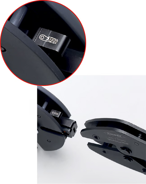 Khuôn bấm được lắp từ phía trước thân kìm. Người dùng gạt cần dịch vụ để đưa hàm kìm về vị trí song song. Tháo khuôn trong vài giây, không cần dụng cụ hỗ trợ. Sau khi lắp khuôn mới, gập cần dịch vụ và kìm sẵn sàng làm việc.