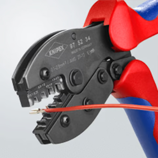 Knipex 97 52 34 sử dụng khuôn bấm cố định, không thay thế. Bốn profile bấm được gia công riêng cho cos trần dạng mở. Hình dạng khuôn phù hợp kiểu ép cuộn, tạo liên kết cơ học và điện ổn định.