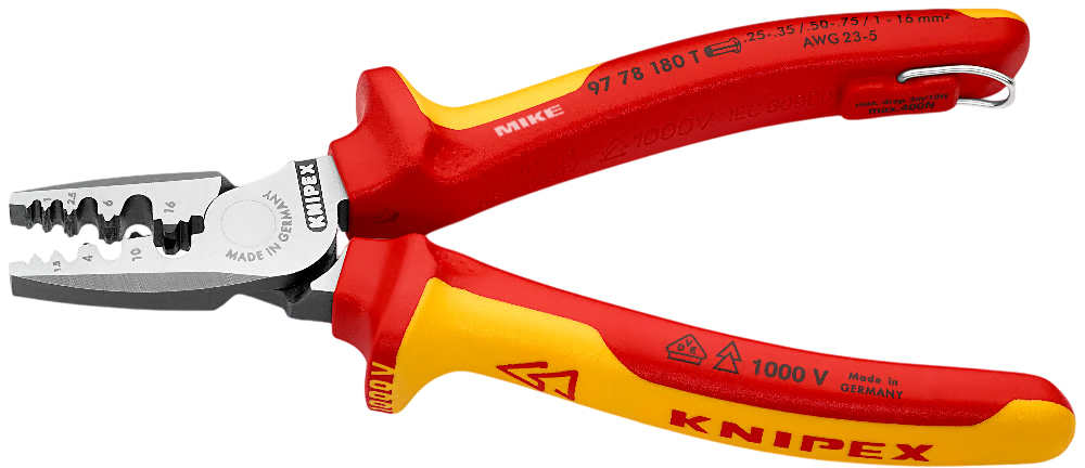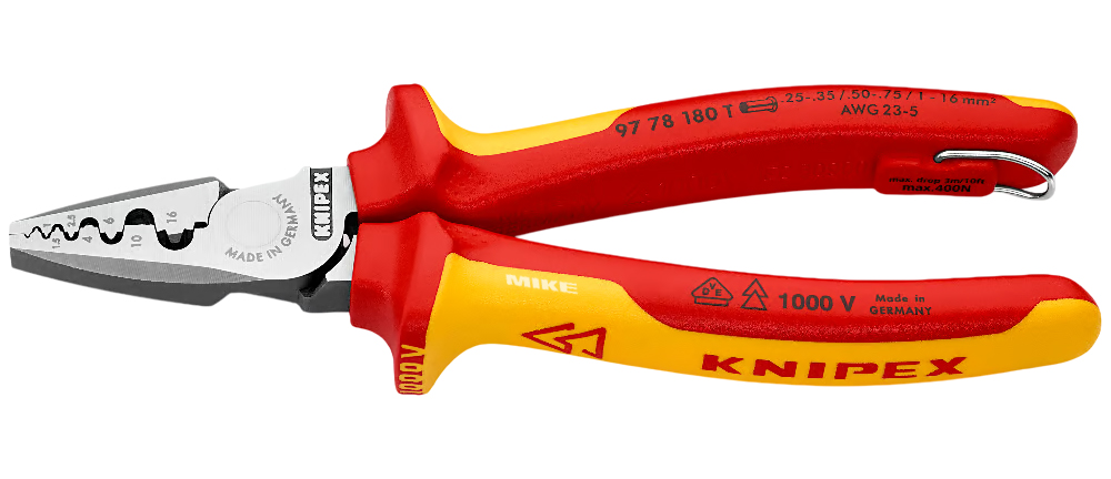 Kìm bấm cos Knipex 97 78 180 T, ép các đầu cos ống tiêu chuẩn DIN 46228 phần 1 và 4, từ 0.25 đến 16 mm². Kìm có cán bọc cách điện đạt chuẩn VDE theo DIN EN 60900 và IEC 60900. Thích hợp dùng trong môi trường điện áp đến 1000 V AC. Điểm khác biệt nhất của model này là có tích hợp sẵn điểm móc nối cách điện. Chống rơi khi thao tác ở vị trí trên cao, nơi dễ gây mất an toàn.