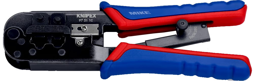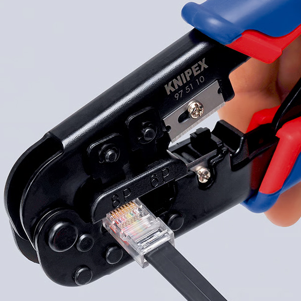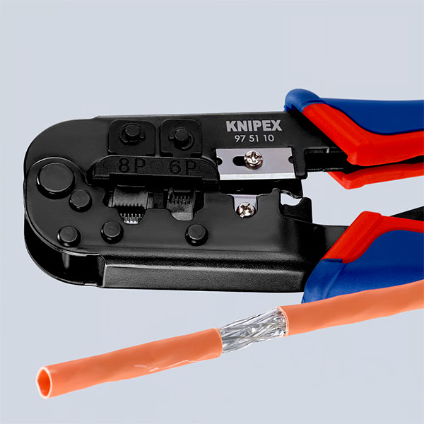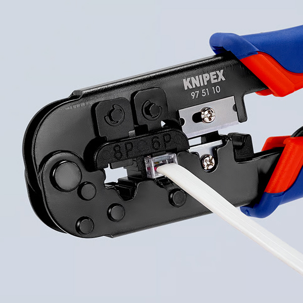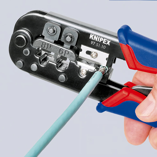 Kìm bấm cos đầu mạng đa năng Knipex 97 51 10, dùng cho các loại đầu Western plug RJ 11/12 và RJ 45. Kết cấu dạng dài, tích hợp dao cắt và lưỡi tuốt dây. Phù hợp cho dây điện thoại dẹt không chống nhiễu hoặc dây mạng loại CAT. Cơ cấu bánh cóc đảm bảo mối bấm đồng đều, có thể mở khi cần. Lưỡi dao chất lượng cao cắt nhanh gọn dây CAT. Thao tác dễ dàng chỉ bằng một tay.