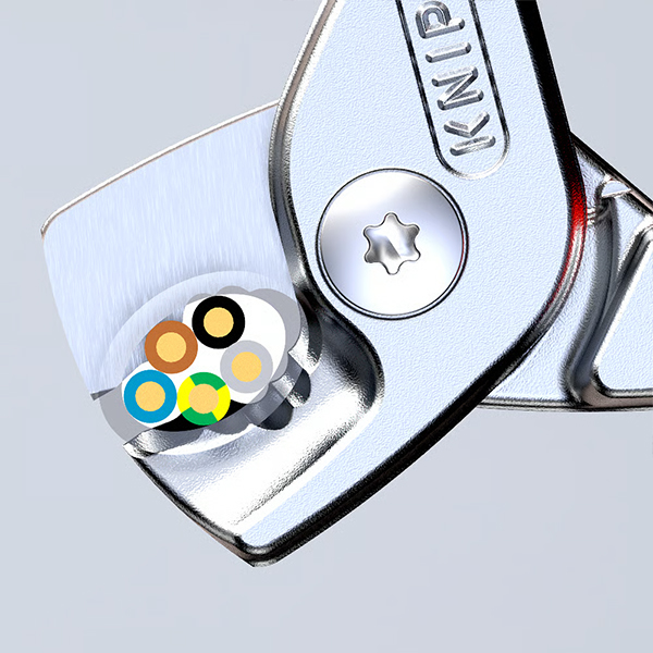 | Chỉ cần bóp nhẹ tay cầm, lưỡi cắt được tôi cảm ứng đã bắt đầu ăn vào lớp vỏ ngoài của cáp nhiều lõi. Quá trình cắt bắt đầu mà không làm biến dạng vỏ. | Khi tăng lực nhẹ, từng lõi dây được đưa vào đúng vị trí theo các rãnh bậc đã được gia công trên lưỡi. Mỗi lõi sẽ nằm đúng mức cắt riêng biệt. | Kìm cắt lần lượt từng lõi, từ các sợi đầu đến phần dây lớn hơn phía sau. Khi cắt dây lõi đồng đặc, có thể cảm nhận rõ ràng từng pha cắt nối tiếp – thao tác nhẹ nhưng hiệu quả. |