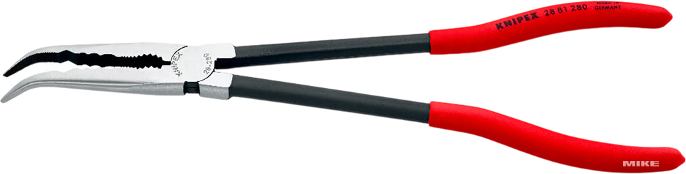 Kìm mỏ nhọn Knipex 28 81 280 có thiết kế chuyên biệt cho các thao tác gắp giữ chi tiết. Dùng trong các không gian có góc nghiêng hoặc vướng vật cản. Tổng chiều dài 280 mm, tiếp cận sâu, trong khi phần đầu hàm được bẻ cong 45°. Tạo góc thao tác linh hoạt ở các vị trí không thẳng trục. Phần hàm hay ngàm có dạng mảnh, khía rãnh sóng nhẹ để giữ ổn định các chi tiết tròn. Chẳng hạn như như dây điện, đầu vít hoặc ống dẫn nhỏ. Đầu kìm phủ đen chống gỉ (black atramentized) và được đánh bóng để tăng khả năng chống oxy hóa. Toàn bộ thân kìm mũi nhọn rèn từ thép công cụ đặc biệt, tôi dầu nhiều giai đoạn, duy trì độ bền và độ đàn hồi tại các điểm chịu lực cao.