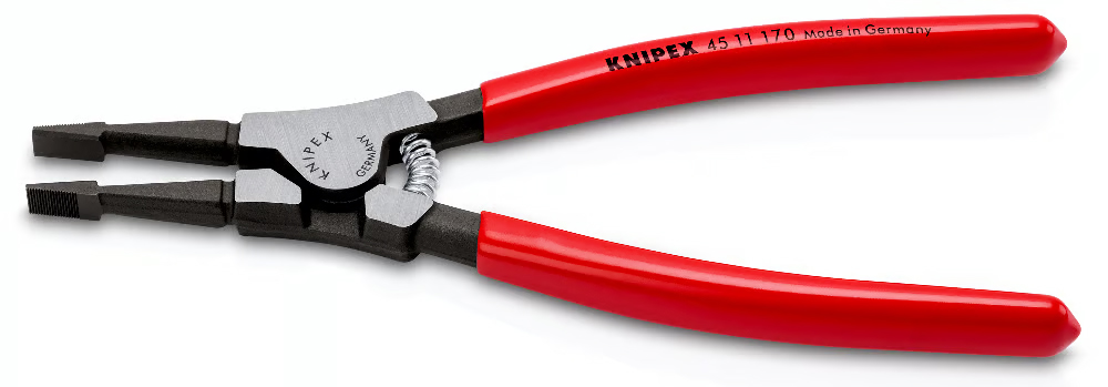 Kìm phe ngoài Knipex 45 11 170 dùng cho thao tác tháo lắp vòng phe chặn trên trục trong trường hợp vòng phe không có lỗ kẹp. Cấu trúc đầu dẹt, kết hợp bề mặt răng cưa gia công trực tiếp. Tiếp xúc trực tiếp với khe hở của phe, kiểm soát lực ổn định. Hạn chế trượt, gây biến dạng vòng phe trong quá trình tháo lắp.