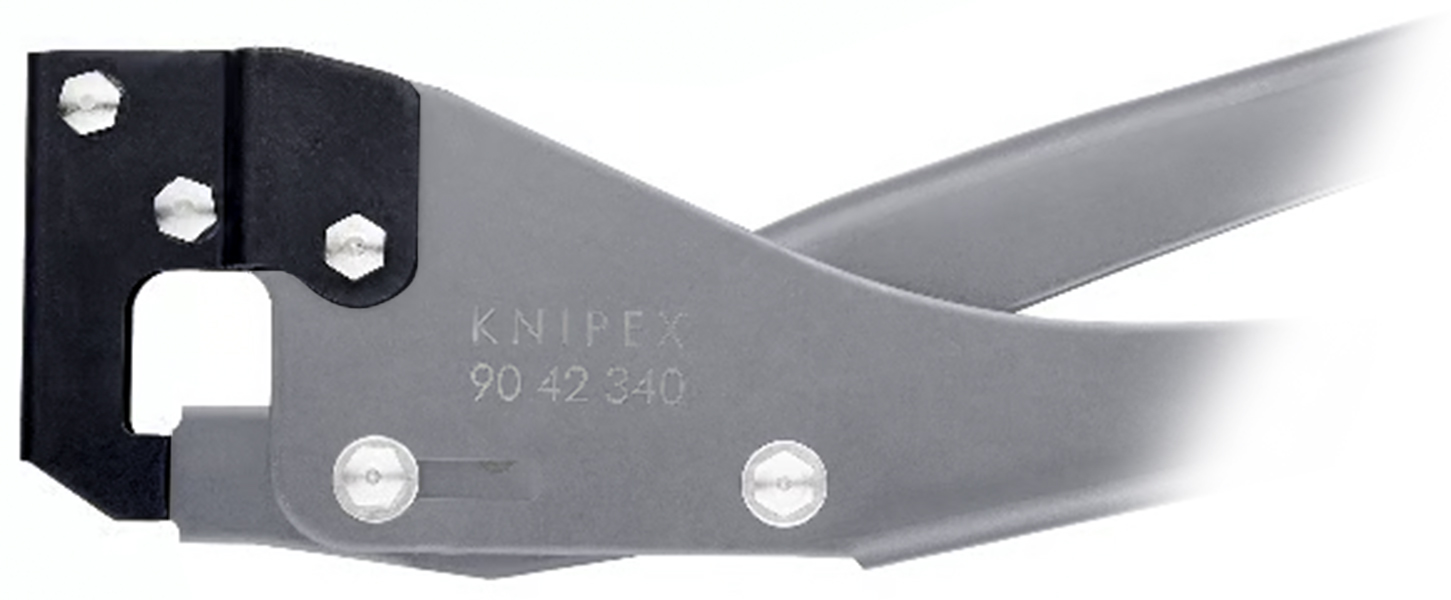 Chế tạo cho kìm bấm rive Knipex 90 42 340. Thép dụng cụ bền, xử lý nhiệt, kích thước 120 x 25 mm, trọng lượng 91 g. Đảm bảo mối nối U, C dày 1,2 mm trong vách ngăn và trần treo. Sản xuất tại Đức, dễ thay thế và sử dụng lâu dài.