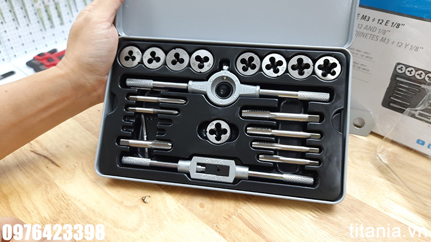 Các kích cỡ taro và dao cắt ren bao gồm M3x0,5, M4x0,7, M5x0,8, M6x1, M7x1, M8x1,25, M10x1,5, M12x1,75 và 1/8'' NPT27, đáp ứng nhu cầu đa dạng của người sử dụng trong cả công việc chuyên nghiệp lẫn hộ gia đình.