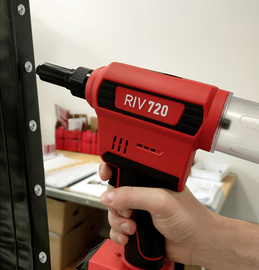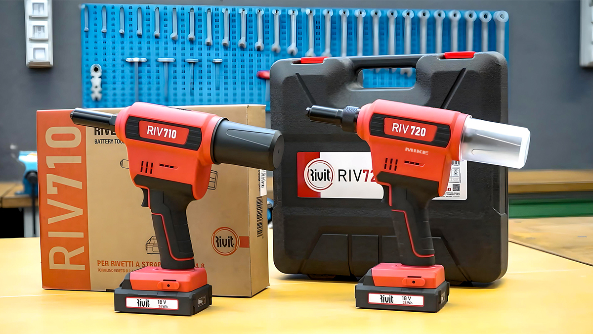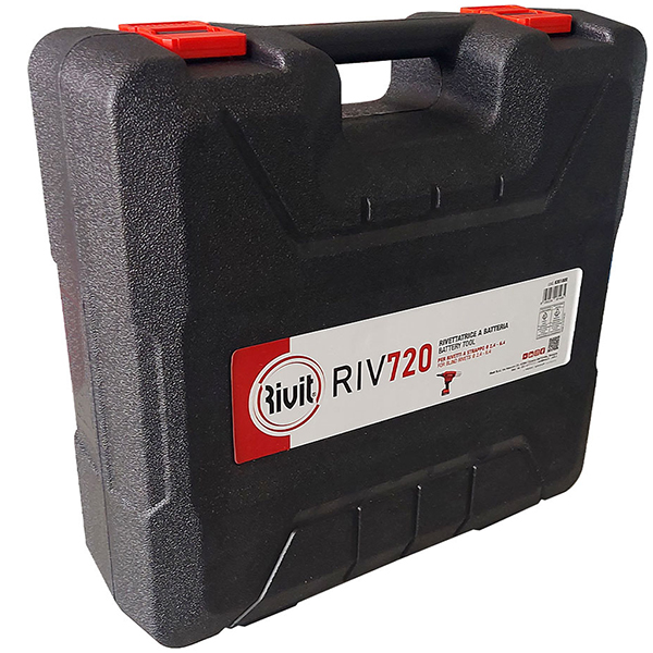 Máy bấm rút đinh tán RIV720 thuộc dòng dụng cụ dùng pin của Rivit Italy. Máy sử dụng cơ cấu kéo động cơ không chổi than và nguồn pin 18V – 2.0 Ah. Máy hỗ trợ thi công đinh tán mù từ Ø 2.4 mm đến Ø 6.4 mm. Bao gồm cả đinh tán kết cấu, trên các vật liệu như nhôm, thép và inox. Đây là thiết bị được thiết kế cho nhu cầu thi công di động hoặc tại xưởng. Dải ứng dụng bao phủ phần lớn các kích thước đinh tán phổ biến.