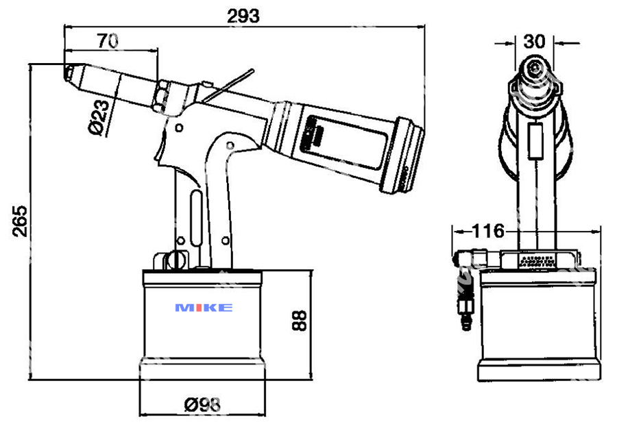 Bấm rút rivet thủy khí cho đinh tán mù Ø 4.0 mm trên thép, inox và Ø 4.8 mm trên nhôm. Hoạt động ở áp suất 6 bar, lực kéo 8500 N, hút rivet tự động, trọng lượng nhẹ 1.43 kg, thích hợp cho thi công liên tục và ứng dụng công nghiệp chuyên nghiệp.