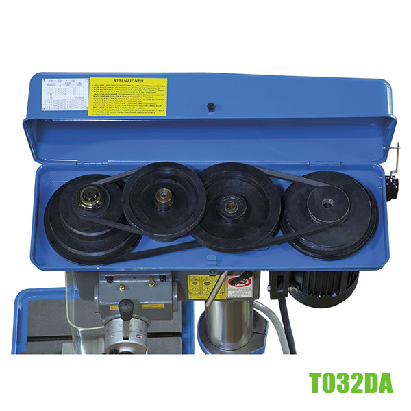 Máy khoan đứng motor 400V 50Hz 0,85kW/1,1kW truyền động bằng dây đai. Tích hợp sẵn một Eto trên bàn máy, và hệ thống làm mát công suất 40W. 8 cấp tốc độ từ 160-2200rpm, khoan max trên gang Ø31,75mm, khoan max trên thép s235jr Ø31,75mm.