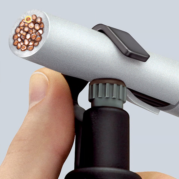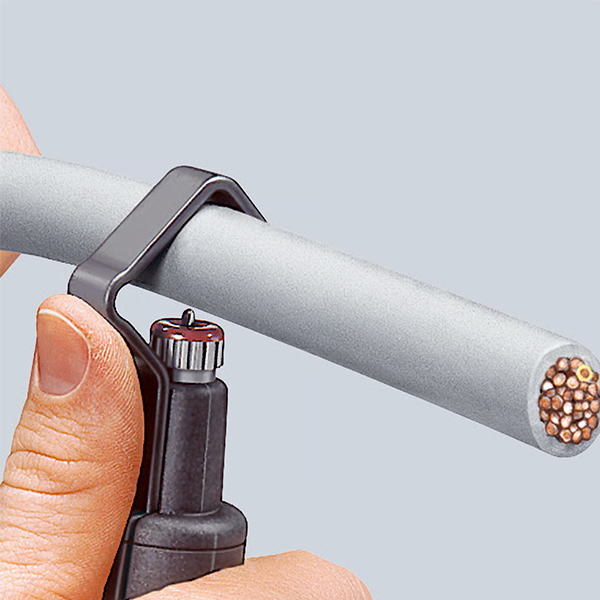 chuyên cắt xoắn ốc và rọc dọc vỏ cáp tròn Ø 6,0–29,0 mm. Tay đòn kẹp tự siết, núm vặn điều chỉnh độ sâu lưỡi cắt. Thân nhựa chịu va đập, lưỡi dao thay thế được. Kích thước 135 x 85 x 36 mm, trọng lượng 120 g.