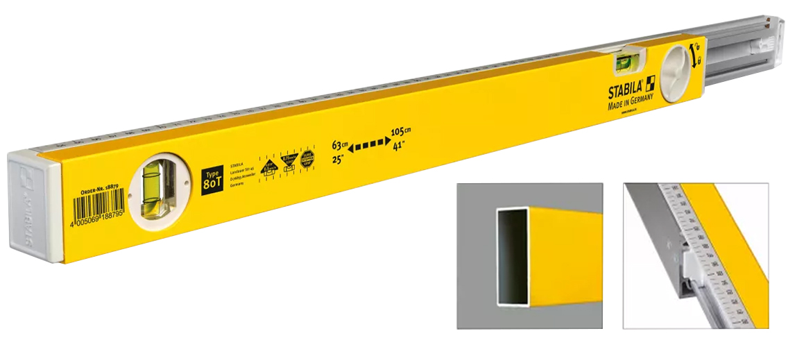 Thước nivo STABILA 80T kéo dài, thu gọn linh hoạt với khung bằng nhôm đúc nguyên khối, phần chân đế lắp ghép có vạch chia. Chi thành 2 phần tách biệt và ăn khớp với nhau bằng rãnh định hình. Hợp kim nhôm cường lực mang lại cho nivo khả năng chịu lực uốn tốt. Ổn định độ chính xác trong khoảng thời gian dài sử dụng.
