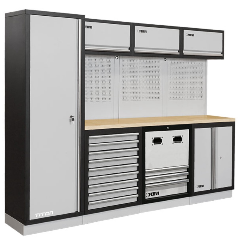 Gồm 4 module, mặt bàn inox, dành cho DIY chuyên nghiệp. Bao gồm tủ treo, tủ cao, tủ ngăn kéo, tủ cuộn dây, thanh kết nối, bảng treo, đèn LED tùy chọn, thép sơn tĩnh điện, đa năng và bền bỉ. Nhập khẩu chính hãng từ Ý.
